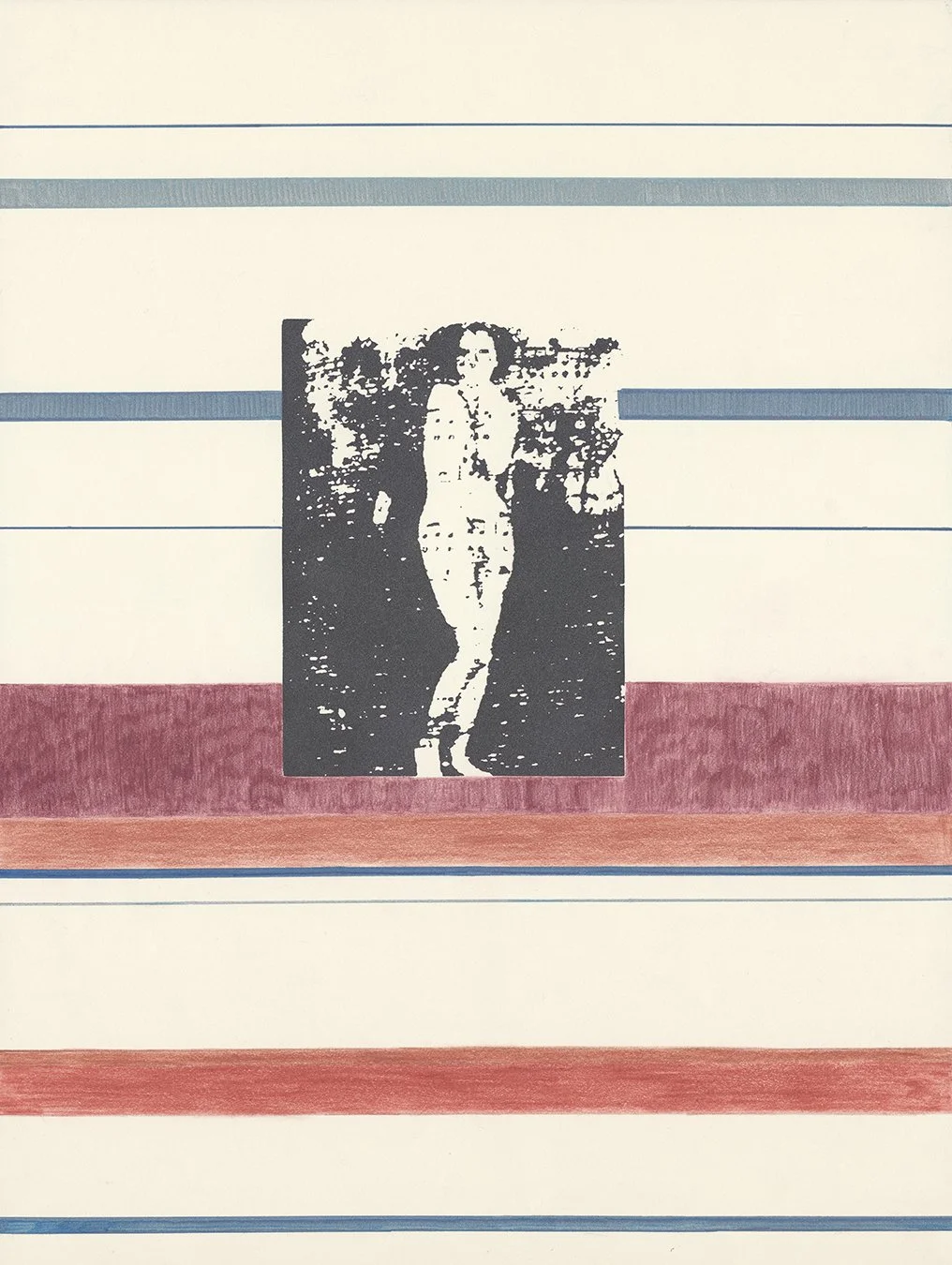 Screenprint, collage, marker and coloured pencil on paper